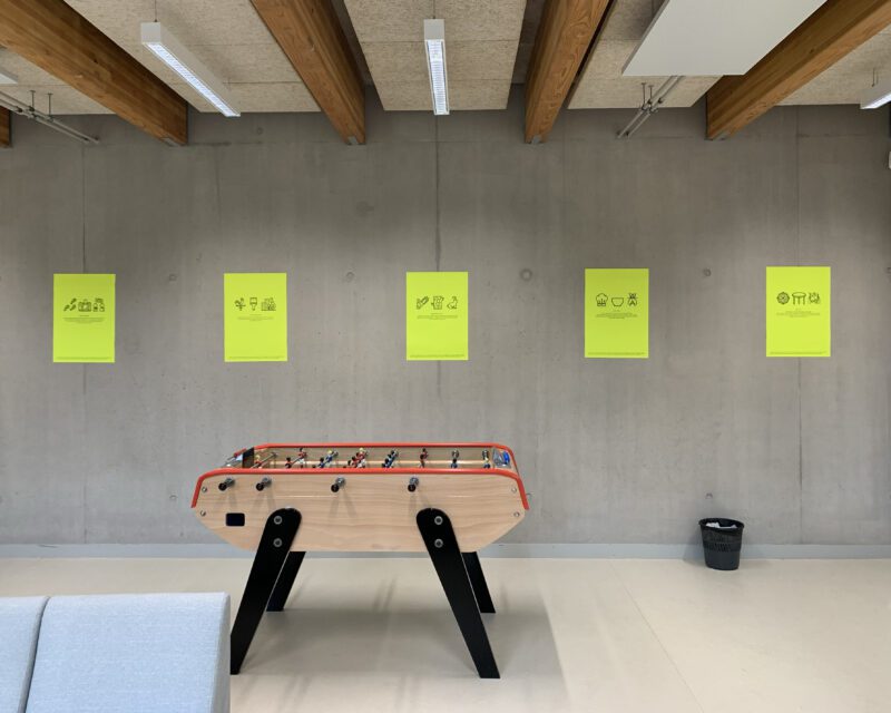 Le duo de designers a fait du lien entre les parties prenantes du projet tout au long de celui-ci en créant différents outils de médiation : un almanach racontant l’aventure de ce 1% artistique, un mobilier sensible installé à l’extérieur du bâtiment et une signalétique.