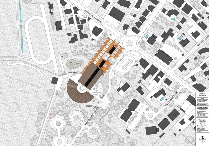 La commune de Biganos, à l’interface entre le Bassin d’Arcachon et l’aire métropolitaine bordelaise, a engagé une réflexion autour de la recomposition d’un véritable centre-ville. Au cœur de cette nouvelle centralité s’ancre un projet de Tiers-Lieu citoyen – « Le Chahut » – qui prend aussi appui sur les enjeux sociaux, sociétaux et urbains engendrés par l’évolution de Biganos. Ce projet, dont la maitrise d’ouvrage a été confiée à l’agence d’architectes Construire, est pensé comme un lieu convivial, accessible et collaboratif et a vocation à promouvoir la pratique citoyenne, la culture, la création et le partage.