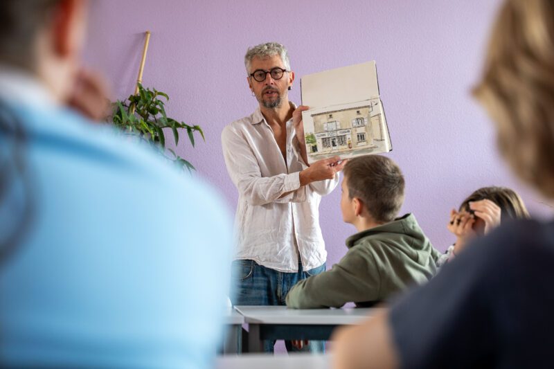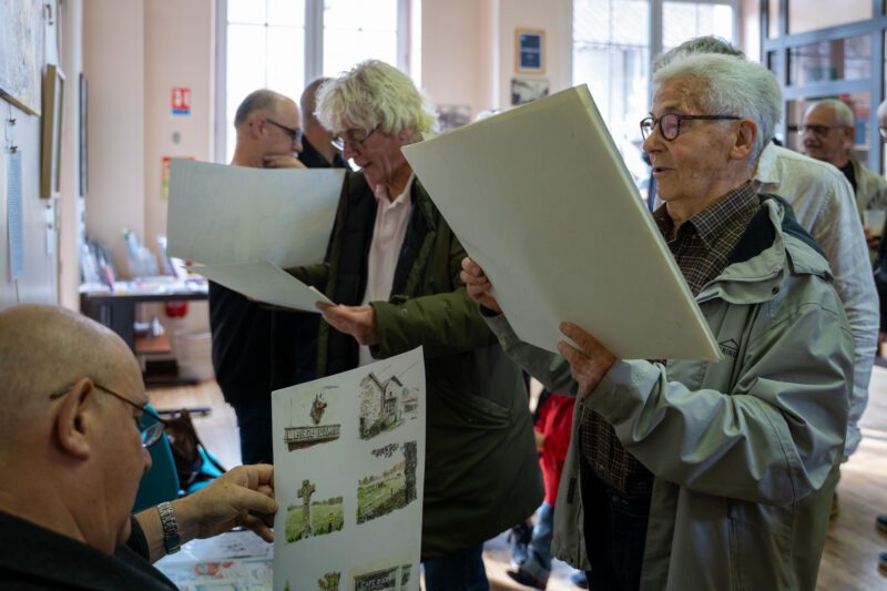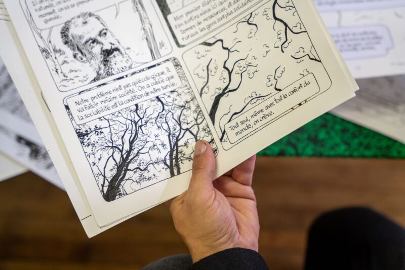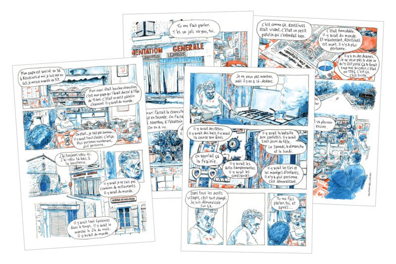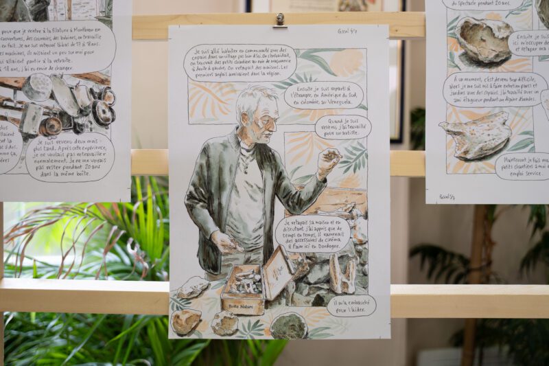 En attendant l’édition du roman graphique, maintenir le lien et le dialogue avec les commanditaires et les habitant·es reste un enjeu majeur ! Aussi, en concertation avec le groupe de Nouveaux commanditaires et la médiatrice, les artistes proposent-ils de présenter l’avancée de leur travail artistique sous la forme d’une restitution différente dans les trois communes. L’objectif : dévoiler en avant-première des planches de bande dessinée accrochées sur des modules en bois facilement transportables. Découvrir des dessins originaux représentant les portraits mis en récit des commanditaires ou ceux et celles de leurs voisins·es, des croquis racontant les fêtes de village, la vie au quotidien et les paysages familiers contribue à l’ancrage du projet au plus près des personnes qui en sont les acteurs et les actrices.